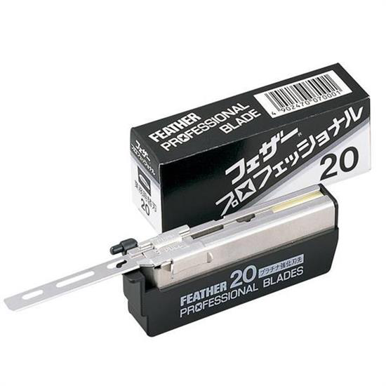 Figyelem! Csak a 20db penge, a képen látható Feather rendszerű borotva csak illusztráció, nem tartozik a termékhez!