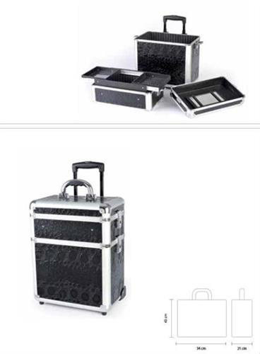 Fodrász táska fekete műbőrborítással. A sok rekeszből álló, gurulós divatos műbőrborítással, erős alumínium vázzal készült táska, szinte minden célra használható.