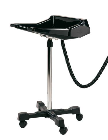 A Német Comair cégtől importált hajmosó tálhoz kifolyó cső is tartozik. Műanyag fejmosó tállal készült, gurulós lábon álló hajmosó. Gurulós műanyag csillag talppal, valamint rugó teleszkópos, állítható magasságú fejmosó tál tartószárral, és kifolyó csővel is rendelkezik.